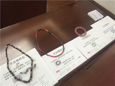 水晶类宝石主要包括水晶、碧玺、海蓝宝石等单晶宝石,因其颜色鲜艳,价格不高,受到不少消费者的喜爱。此次南京市质监局共抽检水晶珠宝商品30批次,包括水晶、石榴石、碧玺3个品类,其中合格26批次,合格率86.7%,不合格项目包括珠宝玉石名称和标识。国家金银制品质量监督检验中心(南京)副主任蔡薇介绍说,不合格的4批次水晶珠宝商品中,名称不合格的有3批次,主要表现在:以假充真,本次抽检中发现有1批次产品将水晶染色当成碧玺,1批次将玻璃当成水晶;以次充好,本次抽检中发现一件碧玺项链中有少数几个珠子一半为碧玺,一半为长石。