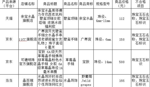 珠宝玉石标识,是用于向消费者做出相关明示。由于天然珠宝玉石产量少,需求量大,为满足不同的消费需求,市场上出现了天然珠宝玉石的人工替代品种,根据规定,人工宝石替代品种以其真实名称销售的为合格产品,宝石经过处理后,在销售时予以说明的为合格产品,而以天然宝石名称销售或不备注经处理的则为不合格品。本次抽检不合格的4批次水晶珠宝商品中,珠宝玉石标识项目均不合格。主要表现在网页未将商品的真实属性合理标注并呈现、告知给消费者。